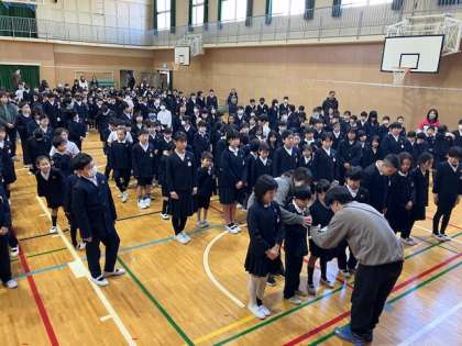 集会後、1年生〜5年生で来週の「卒業をお祝いする会」の練習をしました。言葉を合わせたり、花道を作ったり。