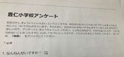 どんな学校がいいか?困っていることはあるか?どんな大人になりたいか?という大きな質問です。ひらがなだけの低学年用と漢字入りの高学年用がありますが、内容は同じです。