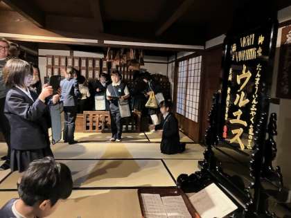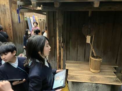 移動すると、そこは江戸時代の町です!町並み、お店やお風呂屋さん、薬問屋さん、長屋、井戸、共同トイレなどなど。初めて見る江戸時代の家に、みんな興味津々です!