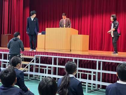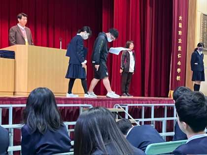 今日から6年生の卒業式練習で、証書授与の練習が始まりました。証書を受け取ってから正面を向くのに、「右足を引いて回ってまた引いて」という動きをしますが、慣れるまではこれが中々難しいようで、多くの子が足をクネクネしていました!