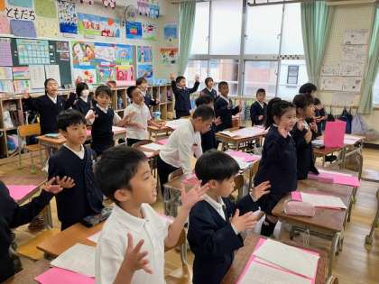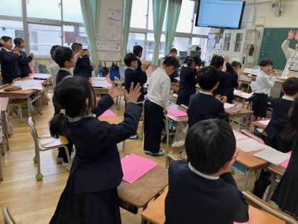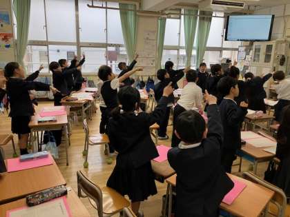 現在、そのための猛特訓中です。まず教室でできるようになってからです。講堂は卒業式バージョンで6年生や5年生が練習を重ねているので、それがひと段落してからですね。