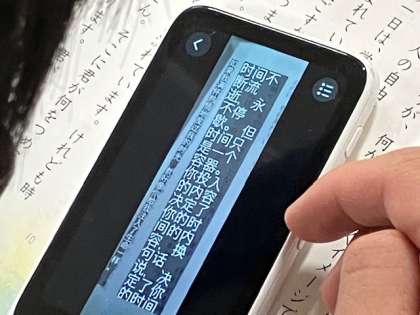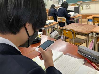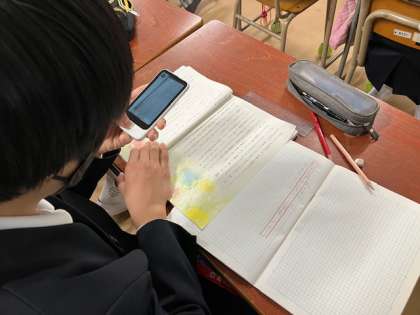 中国から来た子が、自分で翻訳機を使って国語の教科書を読んでいます。