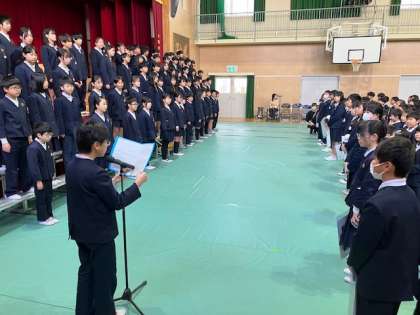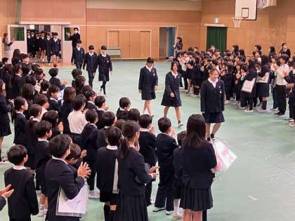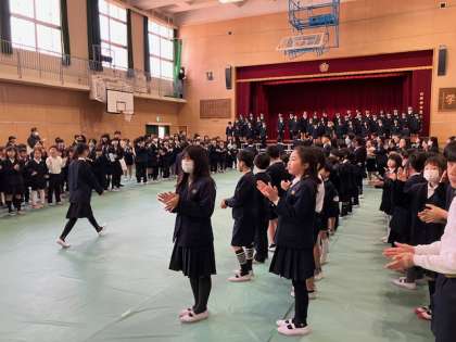 まず1年生から5年生の全員で6年生を拍手で迎えました。