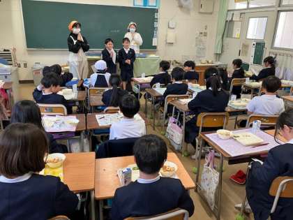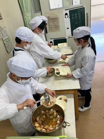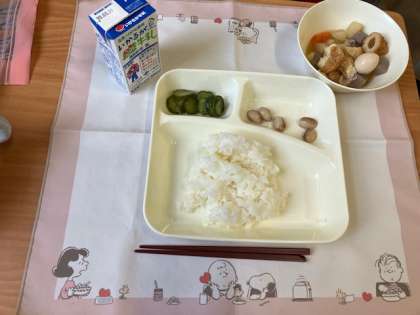 今日の給食献立は、ごはん・関東煮・きゅうりの梅風味・とら豆の煮物・牛乳です。
