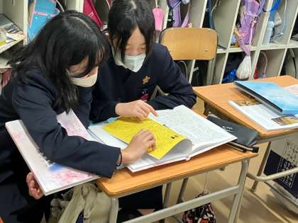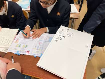 6年生の教室。卒業アルバムといえば、定番のアルバムの後ろにサインペンで色々書くのをしています。