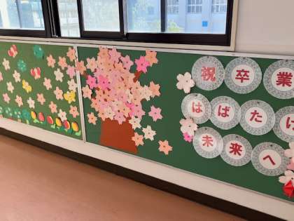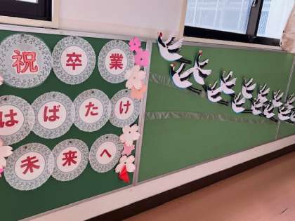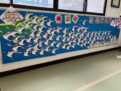 玄関や職員室前に、77羽の鶴が翔び立ちました。花道にふさわしい華やかさですね!