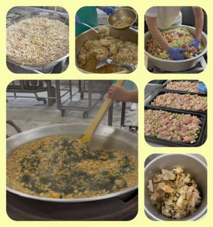「焼きとり」は、しょうが汁、綿実油で下味をつけた鶏肉と白ねぎを混ぜ合わせて焼き物機で焼き、砂糖、みりん、濃口しょうゆを合わせて煮立て、でん粉でとろみをつけた甘辛いタレを配缶時にかけます。