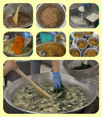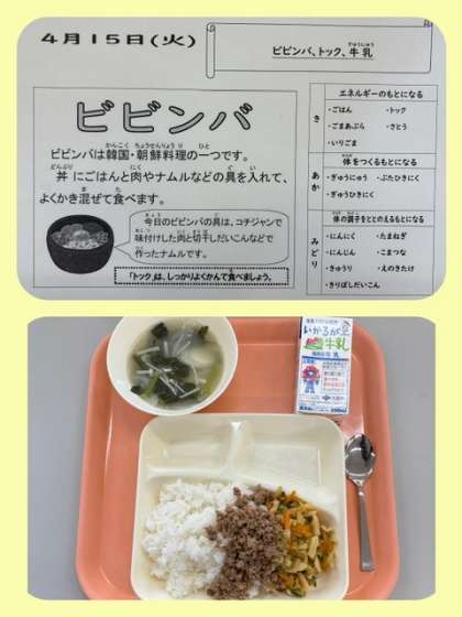 配食時に、ごはんを盛りつけた上に、ビビンバ(肉)と(野菜)の具をかけます。