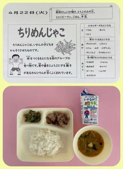 「じゃこピーマン」は、ちりめんじゃこ、ピーマンをいため、砂糖、料理酒、濃口しょうゆで味つけをしています。