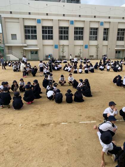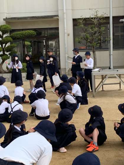 初めてのたて割り班集会がありました。自己紹介をした後、猛獣狩りにいこうよのゲームをしました。最後に2年生から1年生にプレゼントがありました。