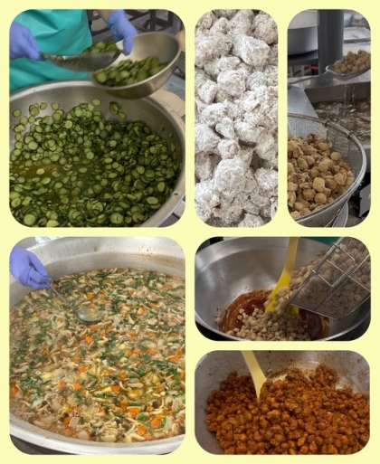 「豚肉と野菜の煮もの」は、豚肉を主材に、じゃがいも、たまねぎ、にんじん、しめじ、青みにさんどまめを使用した煮ものです。