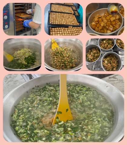 「中華スープ」は、鶏肉、たまねぎ、にんじん、えのきたけ、青みにチンゲンサイを使用し、塩、こしょう、薄口しょうゆ、中華スープの素で味つけしたスープです。