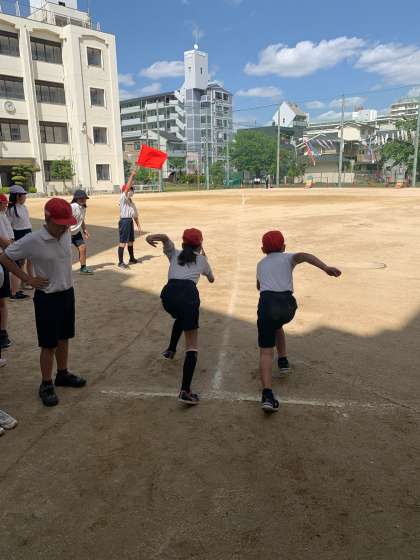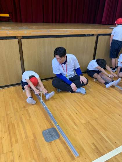 運動場では50メートル走、体育館では長座体前屈の測定をしていました。去年よりどれぐらい記録はのびたかな。