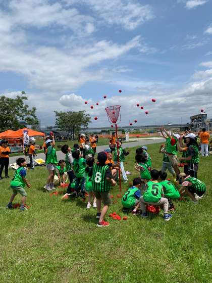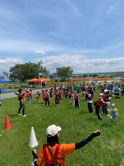 淀川の河川敷でわいわいサンデーが行われました。3人4脚や玉入れ、綱引きなどの競技を楽しみました。ミニ運動会のあとは、おいしいお肉をいただきました。