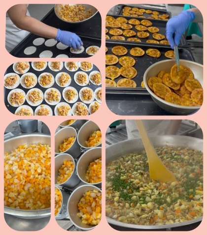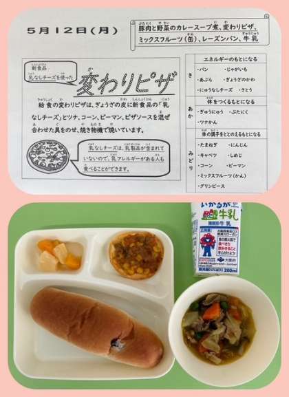 「変わりピザ」は、ツナ、コーン、ピーマン、ピザソース、新食品の乳なしチーズを混ぜ合わせて、ぎょうざの皮にのせ、焼き物機で焼きます。