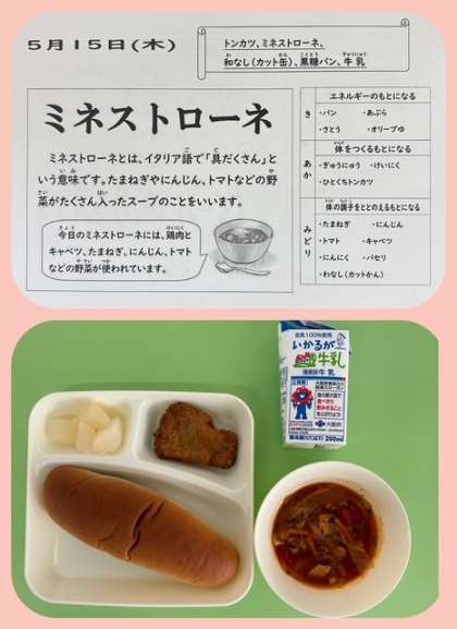 「ミネストローネ」は、鶏肉を主材に、キャベツ、たまねぎ、にんじん、彩りにパセリを使用し、にんにくとオリーブ油で香りよく仕上げたトマト味のスープです。