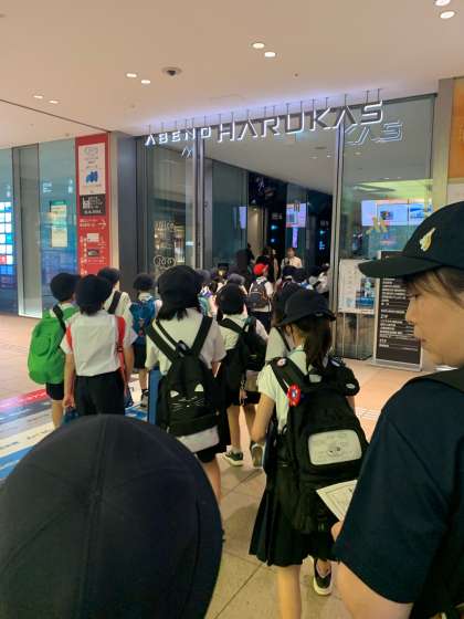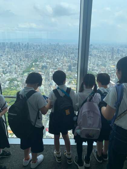 ハルカス展望台から街の様子を見ています。学校が多い、電車がいっぱい走ってるなど、いろいろな事に気づいています。