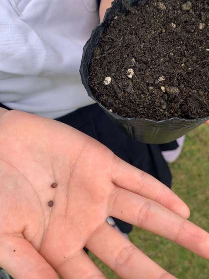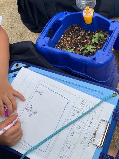 運動場に出てみると、4年生はボールを使った体ほぐし運動、3年生はひまわりやホウセンカの種植え、1年生はあさがおの観察をしていました。どの子もいきいきと学習に取り組んでいました。