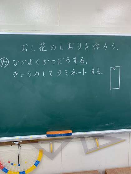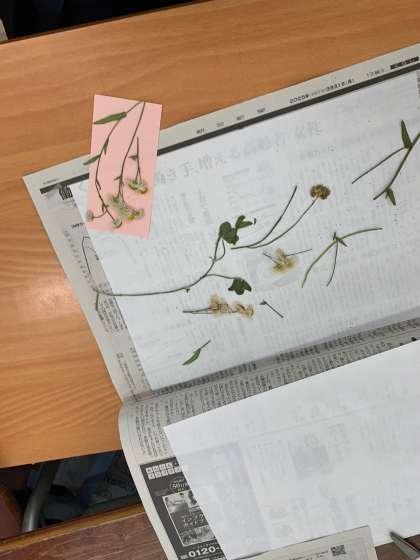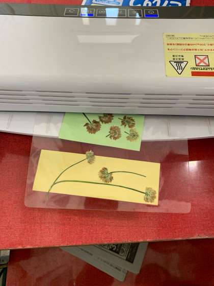 押し花でしおりを作っています。気に入った押し花を画用紙にのせてラミネートします。お気に入りのしおりができました。