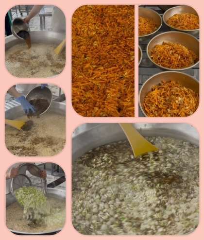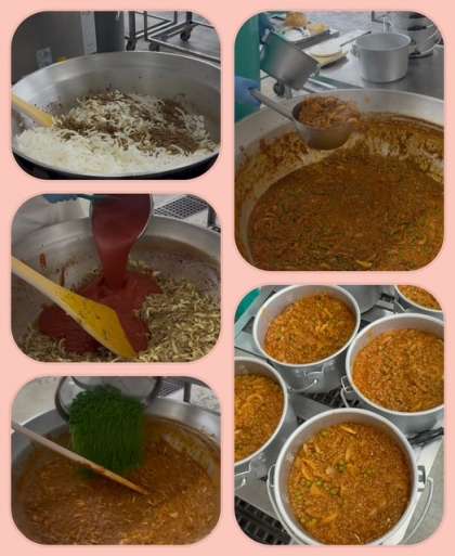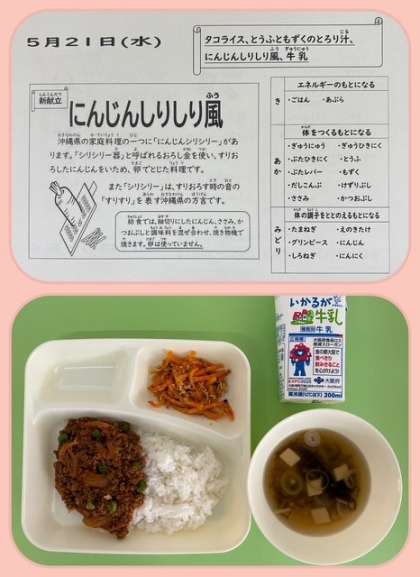 「タコライス」は、にんにくを香りよく炒め、ひき肉、豚レバー(チップ)、たまねぎを炒めて、カレー粉、ケチャップ、ウスターソースなどで味つけし、青みにグリンピースを使います。配食時にご飯の上にかけて、いただきます。