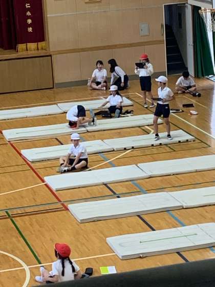 4年生はマット運動です。タブレットを使い、自分の技を確かめていました。