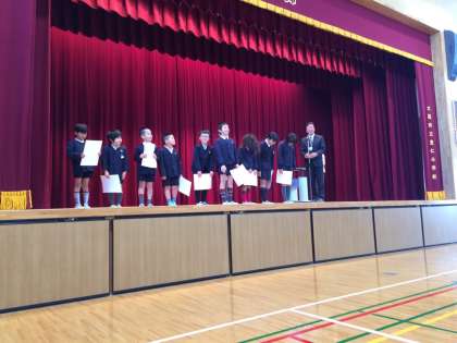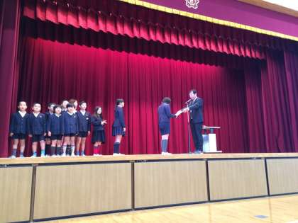 児童朝会で「なかよし学級で学ぶ子どもの図工展」の表彰を行いました。壇上に上がった子ども達は、どの子も誇らしげに表彰状を受け取っていました。
