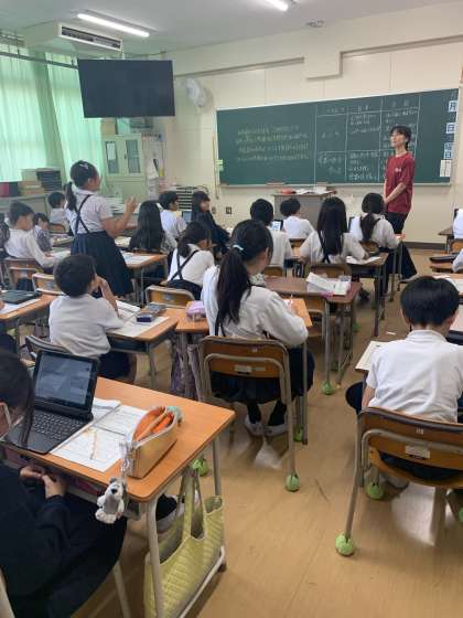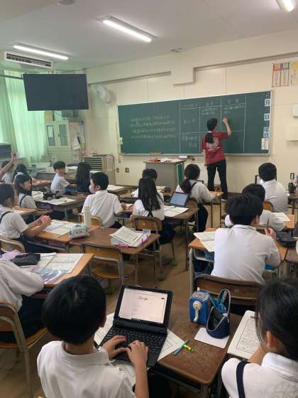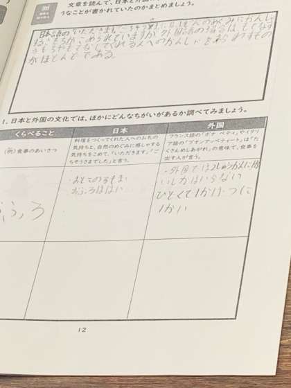 日本と外国の文化の違いについて調べています。おふろや食器の持ち方などについて調べて、まとめていました。