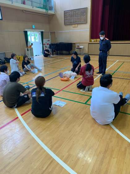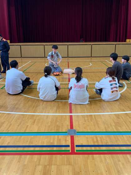 消防署の方にきていただき、救急救命講習を行いました。心肺蘇生法やAEDの使い方を教えてもらいました。