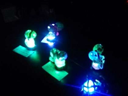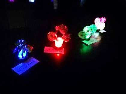 さらに暗いところで、ということで理科室に移動。暗幕を閉めて真っ暗な中で明かりをともすと、幻想的な雰囲気が浮かび上がりました。