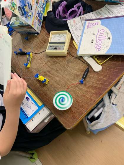 電池の向きを変えると、モーターのまわり方が変わるのか、検流計の針のふれ方が変わるのか、実験して確かめています。