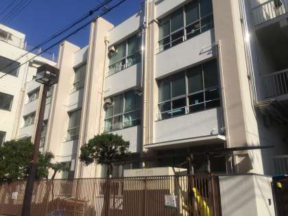 西校舎の外壁塗装工事が終わり、新しい壁面が見えるようになりました。新校舎と同じ配色です。