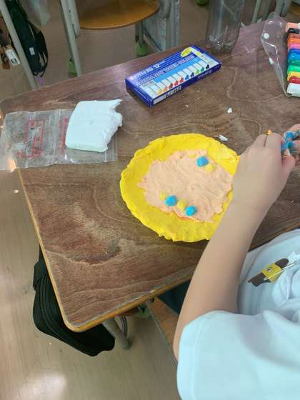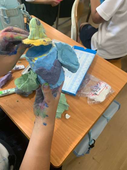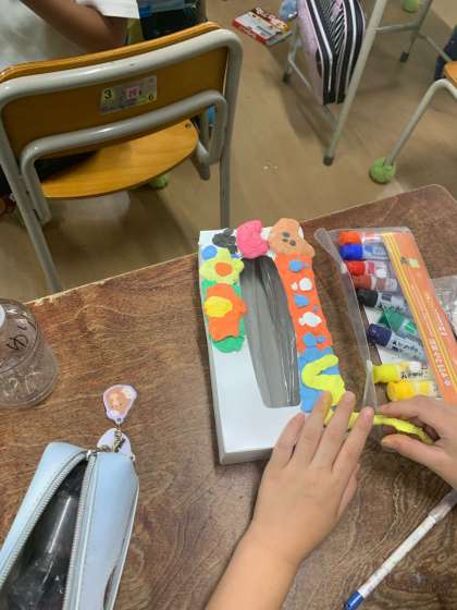 紙粘土を使って小物作りをしています。お皿、貯金箱など考えて作っています。出来上がりが楽しみです。