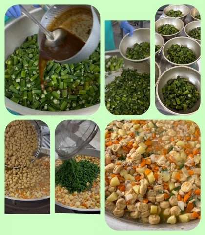 「鶏肉と一口がんもの煮もの」は、鶏肉、じゃがいも、一口がんも、たまねぎ、にんじん、青みにさんどまめを使用した煮ものです。