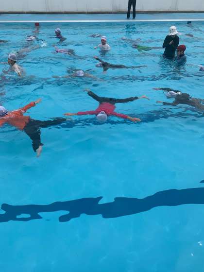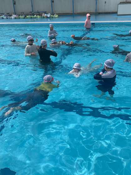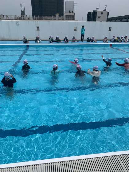 今日は1・3・5年生が着衣泳をしました。もし服を着たまま水の中に入ってしまったら、どうすればいいかを学びました。