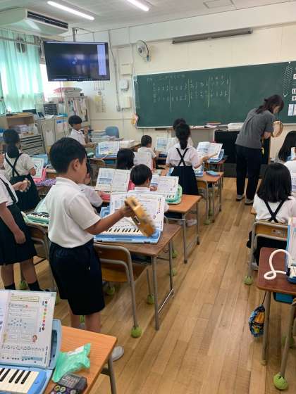 歌に合わせて鍵盤ハーモニカをふいたり、わらべうたを歌いながら体を動かしたりしています。楽しそうにうたをうたっていました。