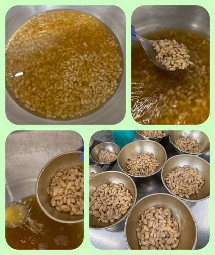 「大福豆の煮もの」は、熱湯に30分間ひたした大福豆を、釜で柔らかくなるまで煮、砂糖、塩、薄口しょうゆを加えて煮含めます。