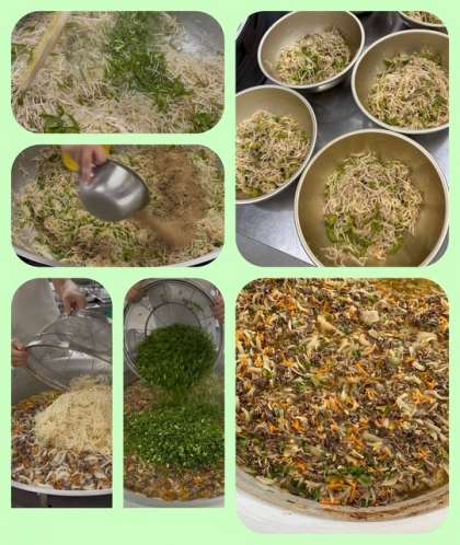 「牛丼」は、牛肉、糸こんにゃく、たまねぎ、にんじん、えのきたけ、青ねぎを使用し、砂糖、みりん、塩、薄口しょうゆ、濃口しょうゆで甘辛く味つけします。