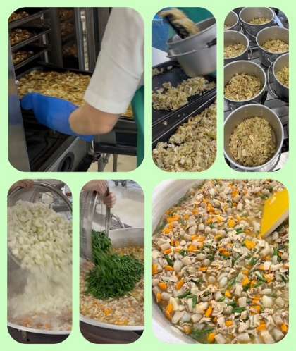 「ささみとキャベツのごまみそ焼き」は、ささみ(油漬け)、キャベツ、練りごま、砂糖、薄口しょうゆ、白みそで作った調味液を混ぜ合わせ、いりごまをふり、焼き物機で焼きます。