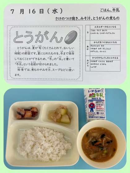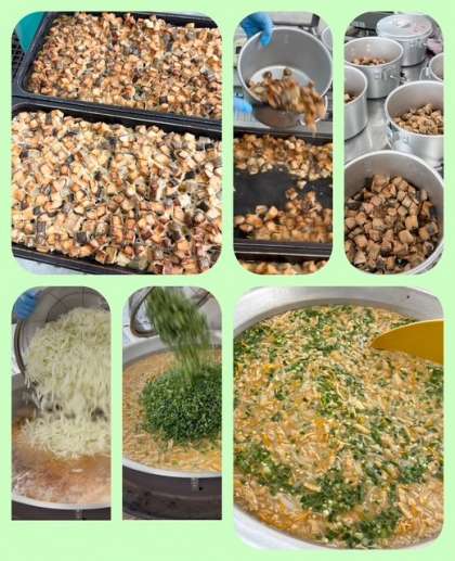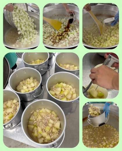 「みそ汁」は、じゃがいも、うすあげ、たまねぎ、にんじん、えのきたけ、青みに青ねぎを使用しています。