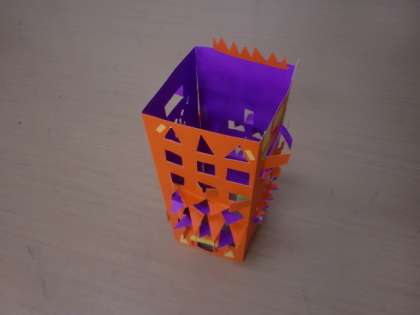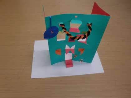 クラフト紙にいろいろな穴をあけたり、切ったりしたものを建物のように立ててみました。