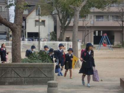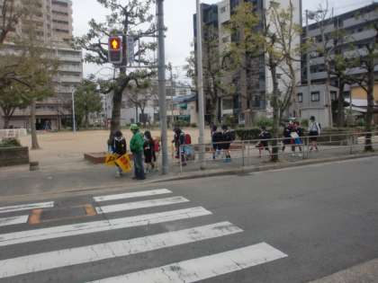 17日に6年生が卒業しますので、金曜日に新班長への引き継ぎを行い、今日から新しい班長が旗をもって集団登校を行っています。