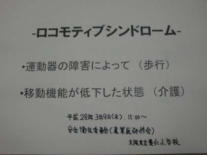 産業医の篠原先生にお越しいただき「ロコモティブ症候群」についてのお話を聞きました。健康寿命を延ばすためには、運動習慣をつけることが大切であるというお話でした。