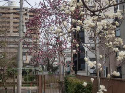 近頃は随分と温かくなったと思っていたら、校庭のモクレン(赤と白)に花が咲き始めていました。春はもうすぐそこまで来ています。
