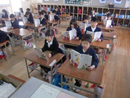 みんな、とてもよい姿勢で、教科書を持って読んでいます。この1年間の成長の一つです。