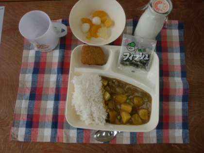 今日は「入学祝い献立」でカツカレー、フルーツ白玉、ミニフィッシュでした。