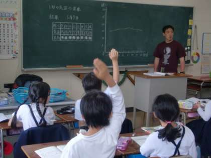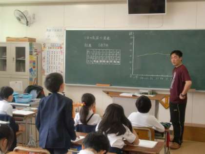 1日の時間ごとの気温の表とグラフを見て、変化の特徴を考えました。