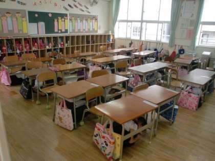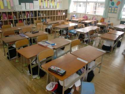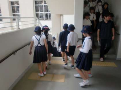 2時間目に、大きな地震と津波を想定した避難訓練を行いました。まずは、机の下に身を隠しました。次に、1時避難場所である講堂に避難しました。