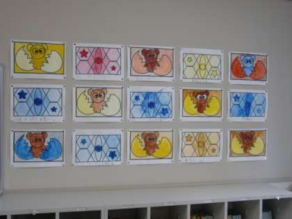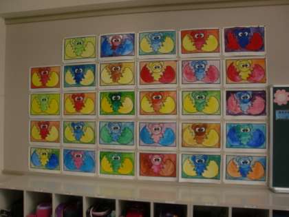 2年生では、水彩絵の具を使います。まず手始めに、「1色の絵の具に水を混ぜ、様々な濃さの色を作って塗りました。」「2色の絵の具をまぜて色を作って塗りました。」