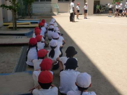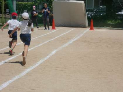 運動場が狭いので、対角線にコースをとってもギリギリです。ゴールの奥にセーフティマットを置いて走ります。