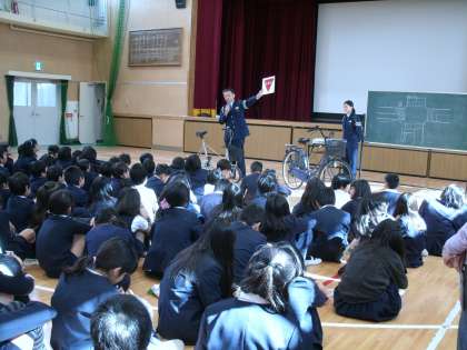 11月13日、大淀警察署交通課のおまわりさんを講師として、交通安全教室を開きました。安全な歩行や自転車の乗り方について学びました。